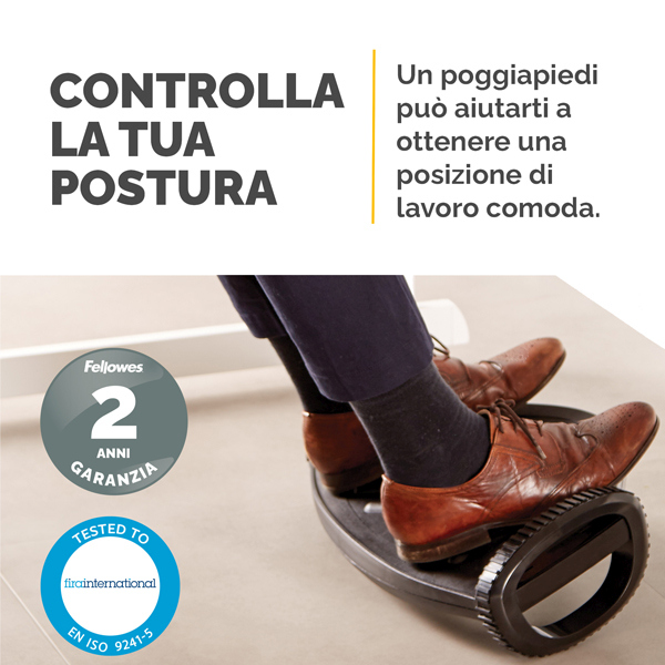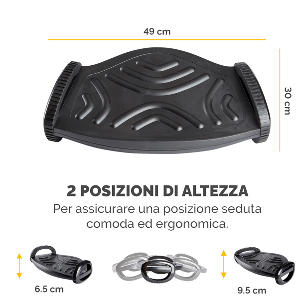 Poggiapiedi Smart Rocker con regolazione dell'altezza in modo semplice ed intuitivo, due livelli di altezza della piattaforma (65mm o 95mm) semplicemente capovolgendo il poggiapiedi. Il movimento oscillante migliora la circolazione e riduce la stanchezza delle gambe. Dimensioni piattaforma: 49x35cm.