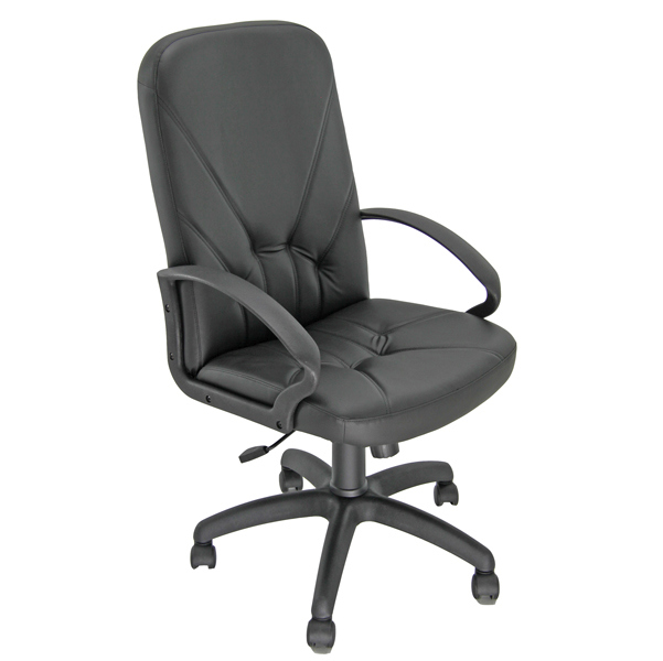 Poltrona in similpelle colore nero con schienale alto. Braccioli e base con ruote in nylon. Meccanismo oscillante con blocchi. Schienale fisso. Elevazione a gas. Altezza totale: 106-118cm. Profondità totale: 62 cm. Altezza seduta: 47/59 cm. Larghezza sedile: 50 cm. Larghezza sedile con braccioli: 57 cm. Altezza schienale: 63 cm. Larghezza schienale: 48 cm. Profondità sedile: 46 cm. Base diametro 62 cm.