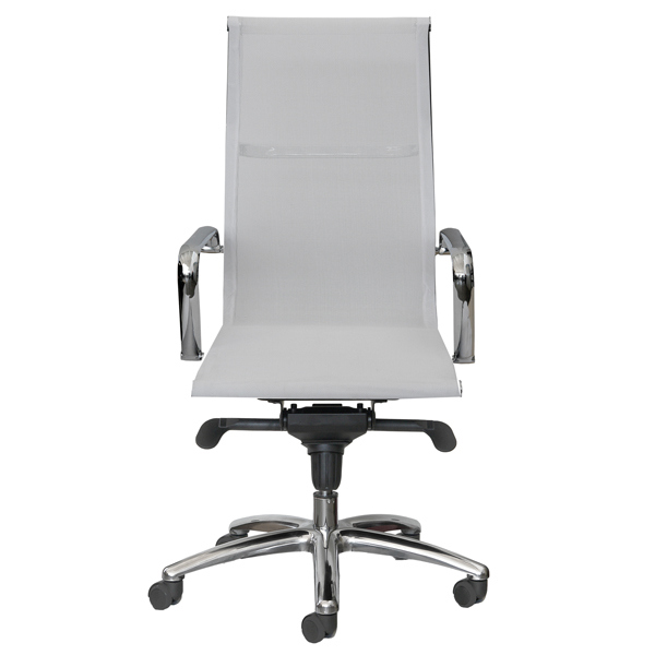 Poltrona direzionale adatta ad un uso intenso. Base in acciaio cromo diametro 66cm. Struttura in acciaio tubolare ellittico cromo. 5 ruote in nylon diametro 5cm. Sedile in rete. Braccioli inclusi (non rimovibili). Meccanismi: elevazione a gas, meccanismo oscillante con blocchi. Schienale fisso con supporto lombare. Altezza totale: 109-119cm; Profondita' tot: 66cm; Alt. schienale: 65cm; Larghezza schienale: 46cm; Larghezza sedile: 48cm; Profondita' sedile: 45cm. Portata massima:110kg.