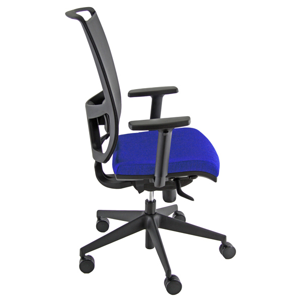 Poltrona semidirezionale ergonomica girevole con elevazione a gas, meccanismo syncro con sedile traslabile anti shock e meccanismo a contatto permanente. Schienale regolabile up-down e supporto lombare regolabile in altezza e profondita'. Completa di braccioli regolabili. Rivestimento in tessuto "SUPER - King L" 100% TREVIRA e reazione al fuoco classe 1. Alt.tot: 108-119cm; ProFormatot: 68cm; Alt.schienale: 65cm; Largh. schienale: 48cm; Largh.sedile: 51cm; Prof.sedile: 46cm; Alt.sedile: 44-55cm.
