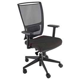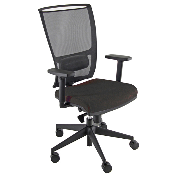 Poltrona semidirezionale H12 (adatta per uso intenso). Schienale alto in rete nera con supporto lombare regolabile. Rivestimento seduta in acrilico ignifugo. Braccioli regolabili e base in nylon. Meccanismo syncro. Meccanismo anti shock, meccanismo a contatto permanente. Schienale regolabile up-down. sedile con traslatore regolabile in profondita'. Elevazione a gas.