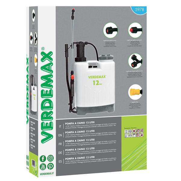 Pompa a zaino meccanica ideale per l'irrorazione di trattamenti per piante e colture e per effettuare servizi di sanificazione. Dotata di cinture regolabili con sgancio rapido. Riempimento dall'alto. Lancia in acciaio inossidabile; 4 ugelli in dotazione: a cono, a doppio cono, a ventaglio ed a 4 fori. Pressione di lavoro variabile in base ad ugello montato. Dimensioni: 30x18,5x H42cm. Lancia75cm. Serbatoio 12 litri.