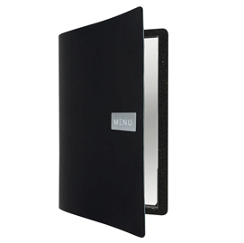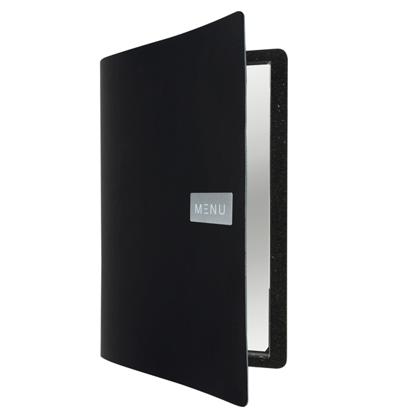 Porta menu' in pelle ecologica, flessibile e facile da pulire. La placca in metallo stampato lo rende particolarmente elegante. Comprende 1 inserto doppio interno (per 4 fogli) in plastica cristallo, trattenuto da un elastico sul dorso. Ogni porta menu' e' fornito con una targhetta metallica extra da personalizzare con il proprio logo. Dimensioni: 24 x 33cm. Puo' contenere fino a 10 inserti doppi per un totale di 40 facciate.