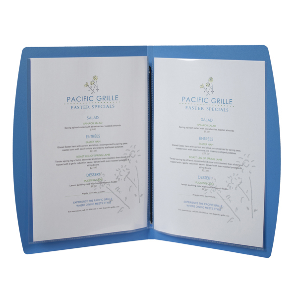 Porta menuu colorato, ecologico dal design semplice e fresco, realizzato in polipropilene antimacchia e antigraffio con etichetta in acciaio inox. Resistente ai raggi uv. Comprende 1 inserto doppio interno per 4 fogli in plastica trasparente, trattenuto da un elastico sul dorso.