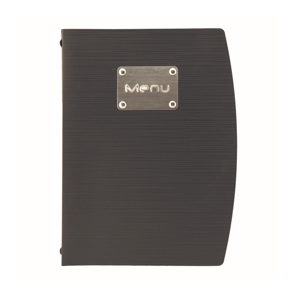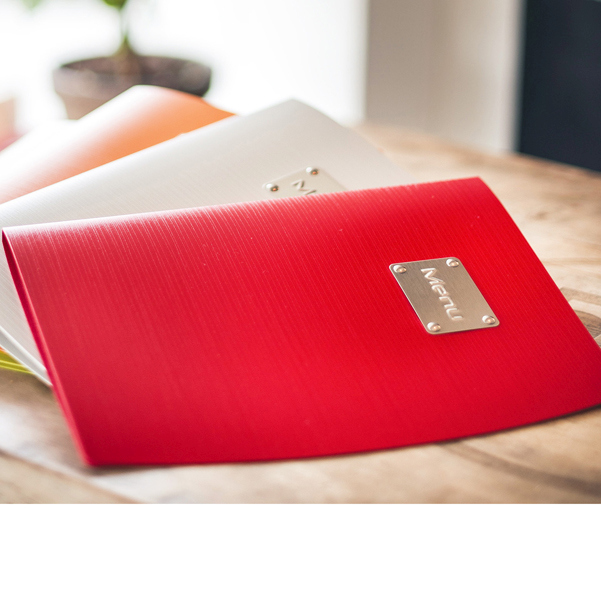 Porta menu' colorato, ecologico dal design semplice e fresco, realizzato in polipropilene antimacchia e antigraffio con etichetta in acciaio inox. Resistente ai raggi uv. Comprende 1 inserto doppio interno per 4 fogli in plastica trasparente, trattenuto da un elastico sul dorso.