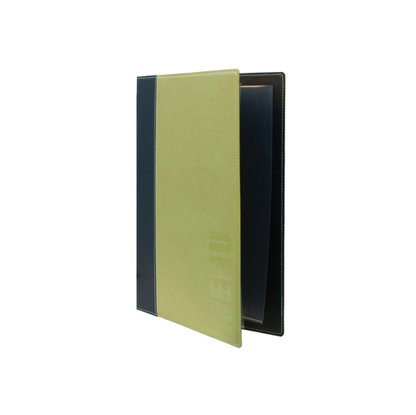 Porta menu' in similpelle dai colori vivaci ed originali. L'ottima qualita' del prodotto e la facilita' nella pulizia lo rendono forte e di lunga durata. Comprende 1 inserto doppio interno (per 4 fogli) in plastica cristallo, trattenuto da un elastico sul dorso. La linea comprende anche la carta dei vini e il portaconto. Puo' contenere fino a 10 inserti doppi per un totale di 40 facciate.