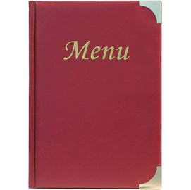 Porta menu' in pvc semplice e classico con angoli in metallo dorato. Formato da 4 buste trasparenti saldate sul dorso e 2 buste saldate sulle facce interne della copertina (per contenere in totale di 10 fogli formato A5.