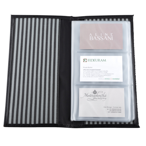 Portabiglietti in similpelle morbido colorato. Interno in tessuto a righe con tasca. Puo' contenere 72 biglietti da visita.