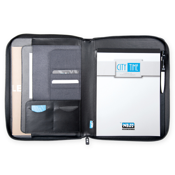 Portablocco in tessuto bicolore. Chiusura con cerniera. Tasca interna con vari scomparti. Completo di blocco. Dimensioni: 26x34cm.
