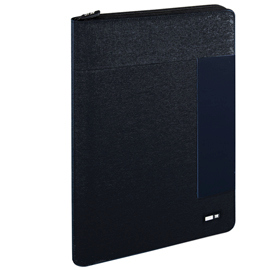 Portablocco in tessuto bicolore. Chiusura con cerniera. Tasca interna con vari scomparti. Completo di blocco. Dimensioni: 26x34cm.