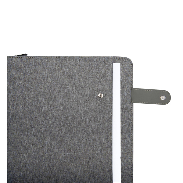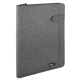 Portablocco in tessuto tecnico e chiusura in ecopelle. Formato A4 chiusura con zip, tasca esterna con chiusura a bottone, scomparti per biglietti, tasca interna portadocumenti, portapenna, completo di blocco. Dimensioni: 25x33,5cm.
