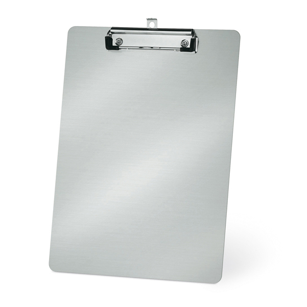 Portablocco in alluminio con molla in acciaio e gancio per l'affissione. Formato interno 23x31,5cm. Colore alluminio.