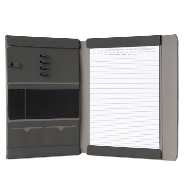Cartella portablocco dotata di alette con chiusura magnetica. Pannello interno con funzione porta cancelleria removibile e richiudibile.