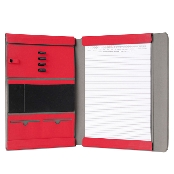 Cartella portablocco dotata di alette con chiusura magnetica. Pannello interno con funzione porta cancelleria removibile e richiudibile.