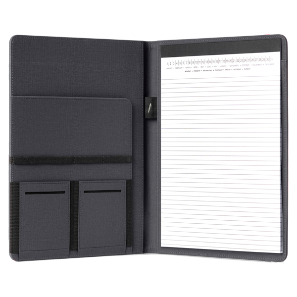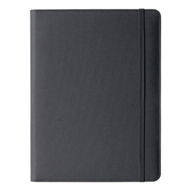 Cartella portablocco con elastico. Copertina con frontale antiscivolo. Dotata di aletta portadocumenti, tasche elastiche, asola portapenne e blocco notes A4.