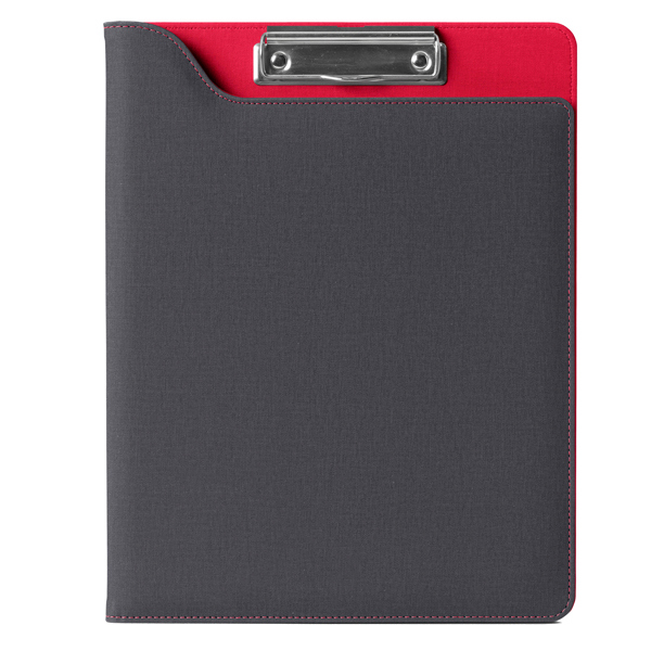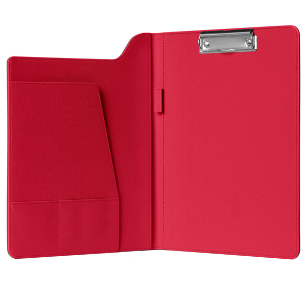 Cartella portablocco dotata di molla in metallo per blocchi A4. Copertina frontale antiscivolo. Dotata di aletta portadocumenti, scomparto per biglietti e asola portapenne.