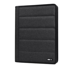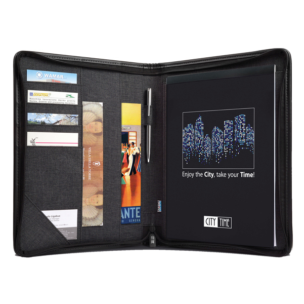 Portablocco in tessuto. Chiusura con cerniera e tasca interna con vari scomparti. Completo di blocco.