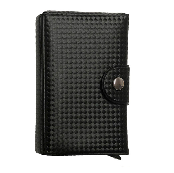 Portafoglio/portacard tascabile a 3 spazi formato card per patente, tessera sanitaria e/o bancomat/ carte di credito, ricevute, scontrini. Aletta interna ferma banconote, foderato in PVC antistatico e antiaderenza. Abbinato al SAFER, custodia in metallo RFID protection per 6/7 carte contactless. Flip di chiusura superiore per evitare la fuoriuscita accidentale delle carte di credito. Copertina in PVC espanso, finitura in fibra di carbonio. Chiusura con bottone metallica a pressione.