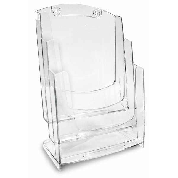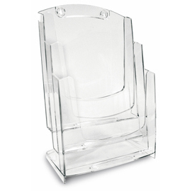 Portadepliant modulare 3 tasche Arda. Portadepliant da parete e da banco a tasca singola. Formato A4. Design pulito ed essenziale, possono entrare uno nell'altro cosi' da guadagnare spazio sul banco. In materiale plastico perfettamente trasparente con dorso leggermente inclinato per garantire la massima stabilita' del materiale esposto. Accoppiabili ad incastro e appendibili a parete. Tipologia prodotto: portadepliant da tavolo. Colore: trasparente. Materiale: plastica. Lunghezza: 182mm. Larghezza: 237mm. Profondita': 357mm. Peso: 807gr. Supporto: si. Numero tasche: 3. Codice produttore: 70A43. Marca Arda.