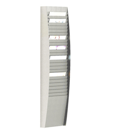 Portadocumenti/portariviste da muro con struttura in polistirene colore grigio chiaro. Modulo a 25 scomparti verticali. Dimensioni scomparto: L23,4 x P0,6 x H29,5cm - parte visibile 3cm. Dimensioni modulo: L27,3 x P12,9 x H112cm. Consegnato pronto all'uso con appositi fori per affissione. Viti non incluse.