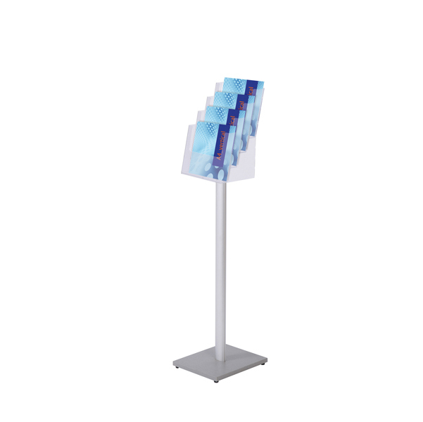 Serie economica. Espositore con stelo in alluminio, base in mdf laccata. A 4 tasche A4. fissaggio delle tasche tramite avvitamento con due viti fornite in dotazione, dimensioni 24x110cm.