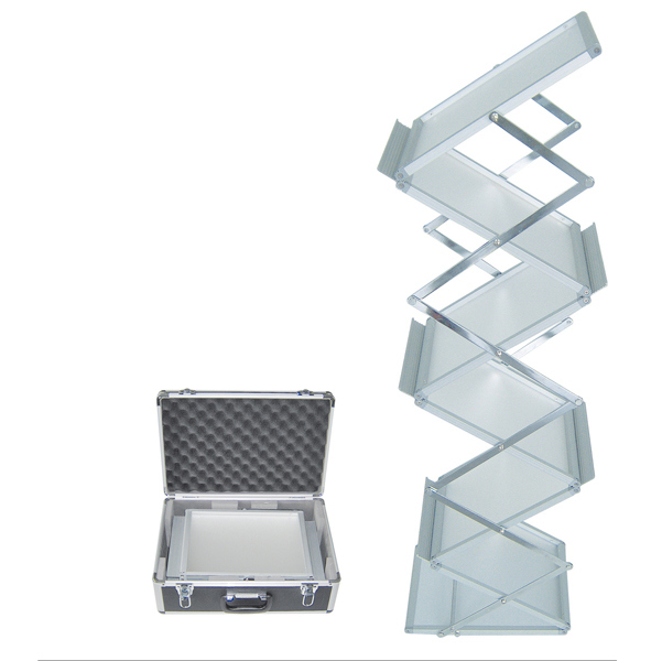 Espositore ideale per essere trasportato, poiche' ripiegabile. realizzato in alluminio anodizzato con 5 ripiani in plexiglass satinato formato A4. Dotato di fermo di sicurezza al piede per garantire stabilita' all'espositore quando aperto. La struttura ripiegatacontenuta in un'elegante valigetta. 31x28x135cm - 5 ripiani a4.