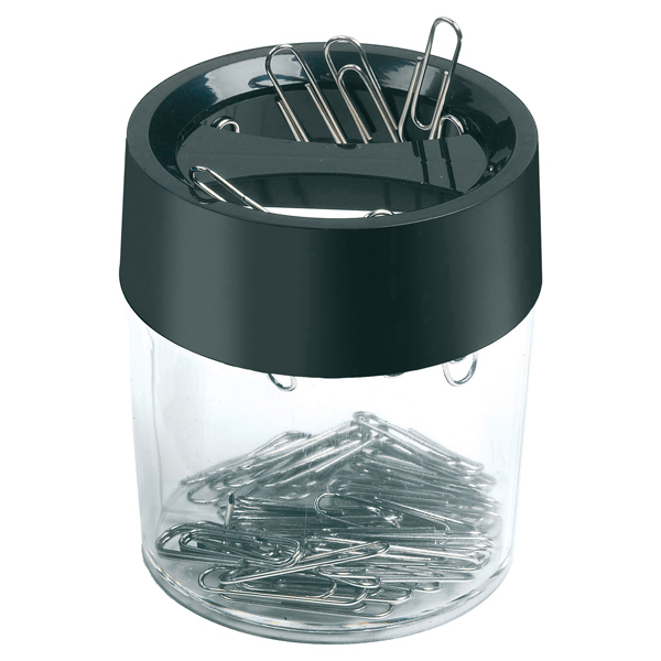 Portafermagli con coperchio calamitato in plastica trasparente, di forma cilindrica. Formato da due spazi separati per differenti fermagli, dimensioni: 5,8x6,8cm.