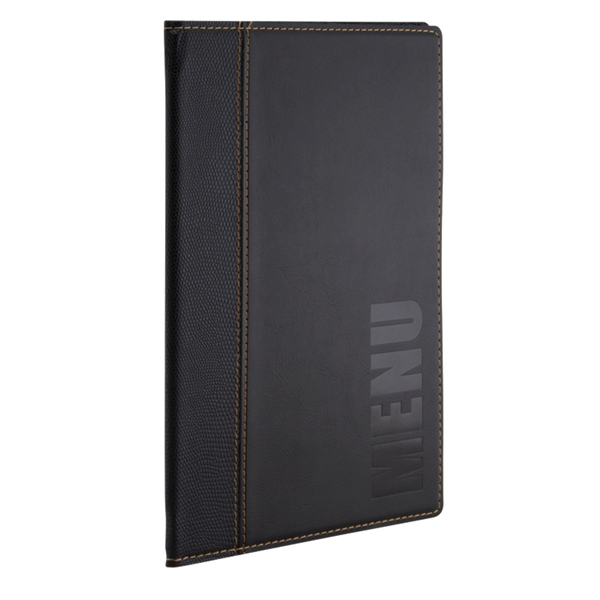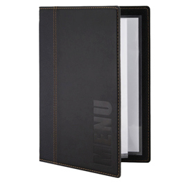 Porta menu' in similpelle con un inserto doppio. Scritta Menu stampata in bassorilievo sulla copertina. Elastico all'interno per contenere gli inserti e bordi rifiniti. Facile da pulire. Misure: 18x25cm. Colore: nero.