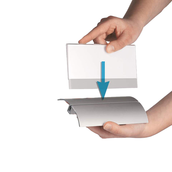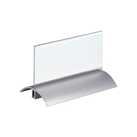In acrilico trasparente e base in alluminio. Questi portanome da tavolo si adattano a qualunque ambiente grazie alla loro eleganza e design. Dotati di cartoncino inserto bianco stampabile con software duraprint.