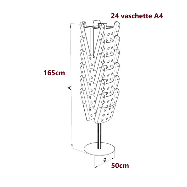 Con vaschette Stacker in materiale plastico antiurto satinato agganciabili tra loro con sistema a scatto. Struttura in alluminio anodizzato montata su ruote e 24 vaschette disposte su tre lati. Dimensioni: 50x50x165cm.