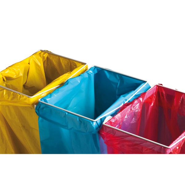 Ideale per la raccolta differenziata. Struttura in acciaio verniciato bianco con 3 portasacchi da 100lt. 4 ruote girevoli antitraccia di cui 2 con freno. Di facile montaggio, molto robusto e maneggevole. Dimensioni 83,3 x 36 x 90 cm - 3x100lt. Si consiglia di pulire la superficie con un panno morbido, imbevuto d'acqua o con un prodotto specifico non aggressivo. Non utilizzare detergenti contenenti acetone, metiletilchetone, percloroetano, toluene, tricloroetano, xilene, idrato d'ammonio, idrato di sodio. Portasacco da 100 lt ciascuno - acciaio.