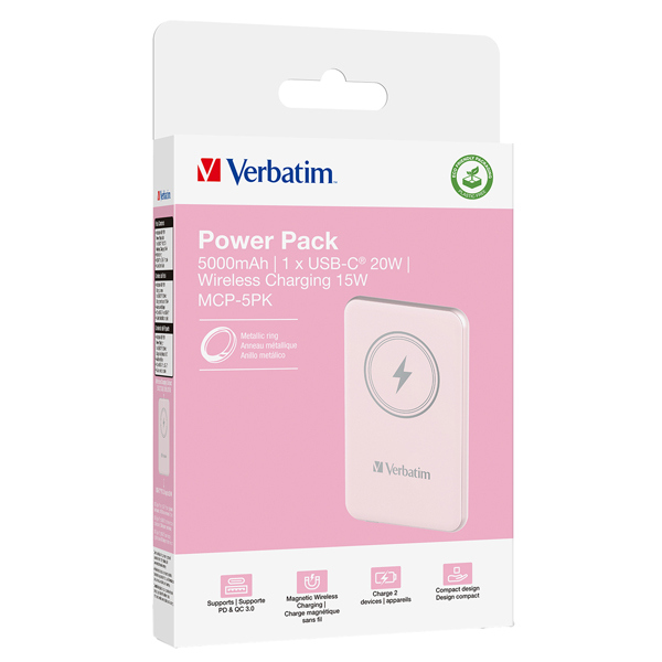 Power Bank Wireless Magnetico 5000 mAh Rosa_ Verbatim Capacita' 5000 mAh: Estremamente sottile - solo 9,6 mm di spessore 15W di ricarica wireless magnetica Capacita' di PD 20W Protezione da sovraccarico del dispositivo Indicatore LED per uno stato di alimentazione di facile lettura Porta Type-C bidirezionale: per la ricarica sia del Power Bank che di un dispositivo esterno.