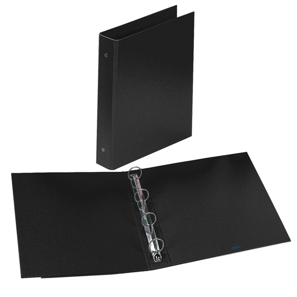 Raccoglitore realizzato in polipropilene con anima di cartone. Texture goffrata Europa per chi ama l'eleganza. Elevata resistenza per un uso quotidiano molto intenso a casa e in ufficio. Meccanismo a 4 anelli tondi (diametro 50 mm). Formato utile 22x30 cm. Formato esterno 29,5x32 cm. Colore nero. Made in Italy.