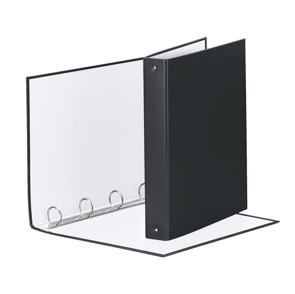 Raccoglitore in robusto cartone da 2 mm di spessore rivestito in polipropilene (bianco internamente). Solidita' e affidabilita' dei materiali rendono il prodotto ideale per un uso intensivo domestico o in ufficio, mentre il rivestimento fornisce eleganza e gradevolezza al tatto. Meccanismo a 4 anelli tondi (diametro 30 mm). Formato utile 22x30 cm. Dimensioni esterne 27,5x31,5x4,5 cm. Capacita' 200 fogli (da 80 gr/mq). Colore nero.