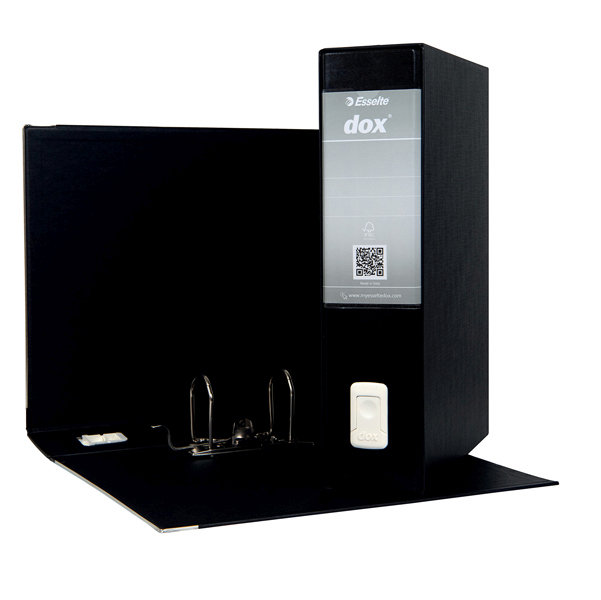 Registratore Dox 2 dotato di linguella per l'estrazione a scomparsa 3 volte piu' resistente, caratterizzata da un design con presa piu' ergonomica, piu' agevole e arrotondata (l'area rientrante suggerisce il gesto per estrarre correttamente). Struttura in cartone rivestito con carta goffrata antimpronta e rifinito con paralati metallici alla base della plancia. Custodia in fibrone rivestito con carta nera goffrata trattata antimpronta, interno nero e parabordi verniciati. Meccanismo a leva in acciaio nichelato con pressino. Dorso in materiale plastico colorato e portaetichette trasparente con etichetta reversibile. Ogni dox possiede al suo interno un volantino con il codice QR da applicare sull'etichetta e 3 semplici indicazioni per scaricare la app dedicata su App Store e Google Play. Dox infatti si trasforma in registratore intelligente grazie a mydox app, la soluzione facile e immediata per archiviare e reperire documenti (tutte le informazioni sono disponibili sul sito www.myesseltedox.com). Formato protocollo (LxH) 23x34 cm. Dorso 8 cm. Colore nero. Dimensioni 85x352x288 mm.