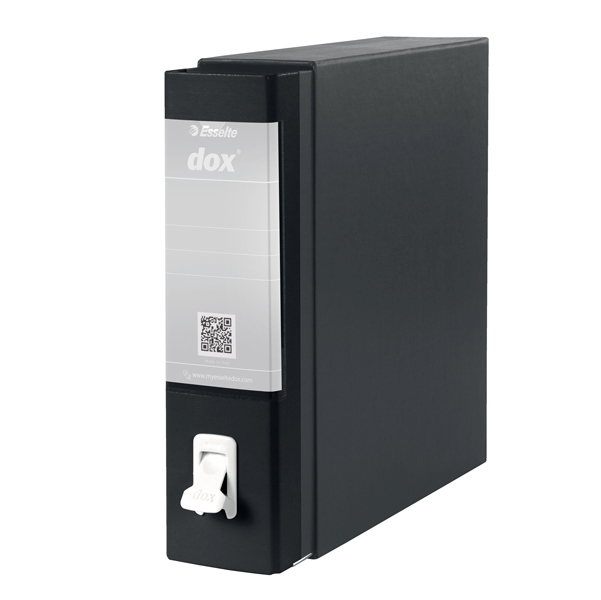 Registratore Dox 1 dotato di linguella per l'estrazione a scomparsa 3 volte piu' resistente, caratterizzata da un design con presa piu' ergonomica, piu' agevole e arrotondata (l'area rientrante suggerisce il gesto per estrarre correttamente). Struttura in cartone rivestito con carta goffrata antimpronta e rifinito con paralati metallici alla base della plancia. Custodia in fibrone rivestito con carta nera goffrata trattata antimpronta, interno nero e parabordi verniciati. Meccanismo a leva in acciaio nichelato con pressino. Dorso in materiale plastico colorato e portaetichette trasparente con etichetta reversibile. Ogni dox possiede al suo interno un volantino con il codice QR da applicare sull'etichetta e 3 semplici indicazioni per scaricare la app dedicata su App Store e Google Play. Dox infatti si trasforma in registratore intelligente grazie a mydox app, la soluzione facile e immediata per archiviare e reperire documenti (tutte le informazioni sono disponibili sul sito www.myesseltedox.com). Formato commerciale (LxH) 23x29,7 cm. Dorso 8 cm. Colore nero. Dimensioni 85x315x288 mm.