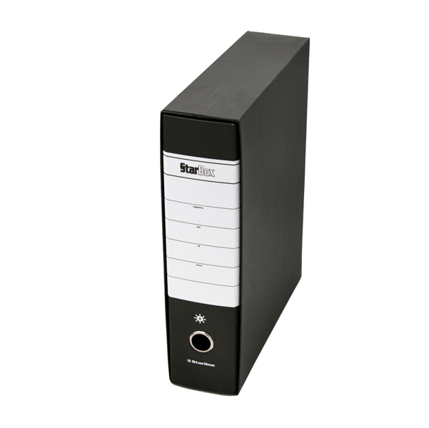 Registratore STARLINE sfuso colore Nero modello Starbox Sfuso. Con struttura in cartone rivestita in carta goffrata stampata e risguardo bianco. Dotato di meccanismo a leva in acciaio nichelato con pressino. Custodia in fibrone nero rivestita in carta usomano. Anello di estrazione in metallo. Il registratore Starbox e' disponibile in 4 Modelli (Protocollo e Commerciale, Dorso 5 e Dorso 8) e in un'ampia gamma di colori. Modello Starbox Protocollo. Colore Nero. Materiale cartone. Tipologia registratori a leva. Dimensioni esterne 28,5x35,5cm. Dorso 8cm. Formato utile Protocollo 23x33cm (lxh). Custodia compresa. Meccanismo a leva con pressino. Vendita di un solo registratore Starline. Articolo STL4015S. Codice produttore 0201929.NE e STL4015 sfuso. Marca Starline.