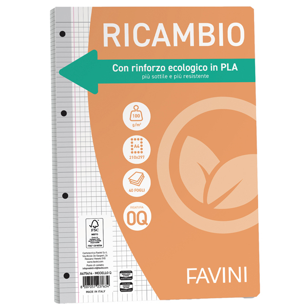 Ricambi con rinforzo ecologico. Il rinforzo, più sottile e più resistente, è realizzato in bioplastica di origine 100% vegetale totalmente compostabile e biodegradabile. Carta da 100gr, formato A4.