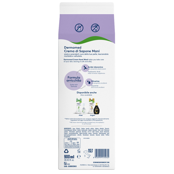 Dermomed crema di sapone mani aiuta a prenderti cura della tua pelle, lasciandola liscia e seducente. Formula arricchita: Acido Ialuronico con proprieta' elasticizzanti e glicerina con proprieta' emollienti. Contenitore di carta, risorsa rinnovabile, con certificato di riciclabilita' Aticelca 501:2019 UNI 11743:2019. Il contenitore deriva da una filiera trasparente e certificata secondo gli standard internazionali FSC, ONG che promuove la gestione responsabile delle foreste del mondo. La sua struttura semi-rigida pratica, maneggevole e resistente garantisce un utilizzo piu' semplice rispetto alla doypack, un controllo preciso del dosaggio, uno svuotamento completo, senza sprechi. Contiene Bitrex - benzoato di denatonio, una sostanza innocua se viene ingerita, che viene aggiunta al prodotto, e dal sapore amaro e sgradevole che evita l'ingestione accidentale del prodotto da parte dei bambini.