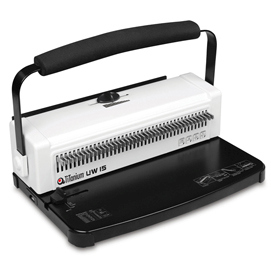 Rilegatrice a dorsi metallici con struttura e base in metallo. Adatta per l'uso intensivo. Sistema di perforazione manuale. Capacita' perforazione 15 fogli. Capacita' di rilegatura 125 fogli. Spirale massimo 14mm. Guida laterale regolabile ai formati A4 e A3 in due passaggi. Guida per la misura della spirale si. Dimensioni 280x160x430mm. Peso 9,2kg. Dorsi metallici.