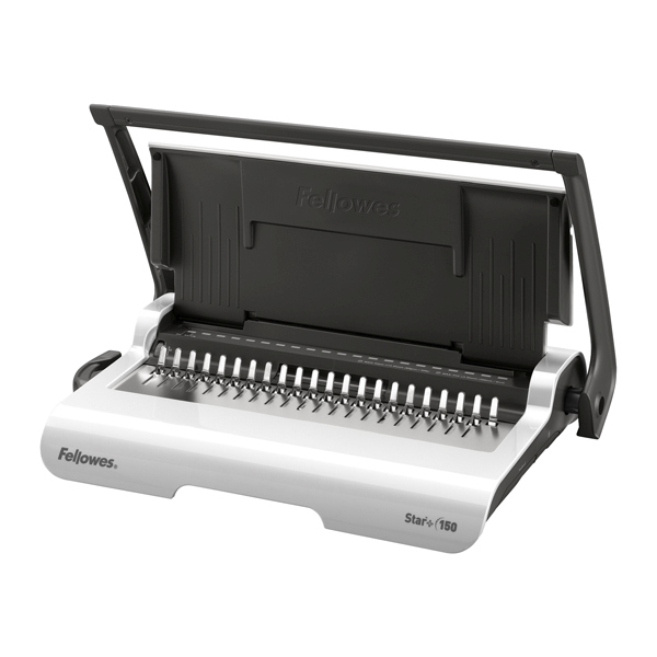 Rilegatrice personale A4 ad alto rendimento. Compatta e facile da usare, robusta ed elegante, rilega dorsi da 6 a 18mm. Perfora 15fg alla volta e rilega max 150fg. Il coperchio e la leva di perforazione si ripiegano per consentire di conservare la macchina sia orizz. Sia vert. Completa di vassoio per conservare i dorsi e guida alla scelta del diametro.