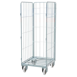 Carrello Roll Container con 3 sponde laterali, in filo zincato, 4 ruote nylon 10cm, 2 fisse e 2 girevoli. Portata 500kg. Dimensioni: 70Lx80Px179Hcm. Fornito smontato.