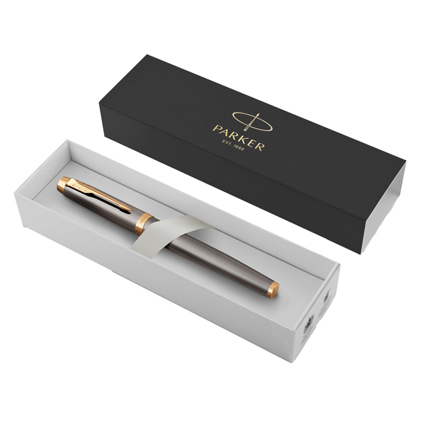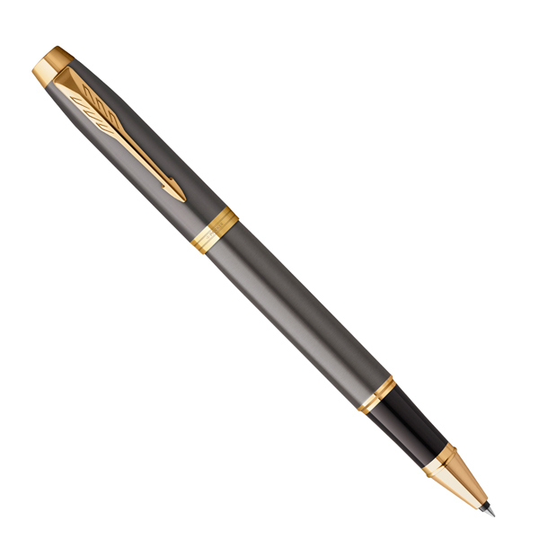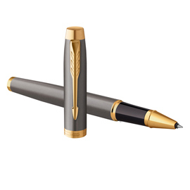 Elegante penna roller dotata di fusto in acciaio inox laccato grigio arrichito da dettagli in oro. Incluso refill nero. Fornita con esclusivo astuccio Parker.