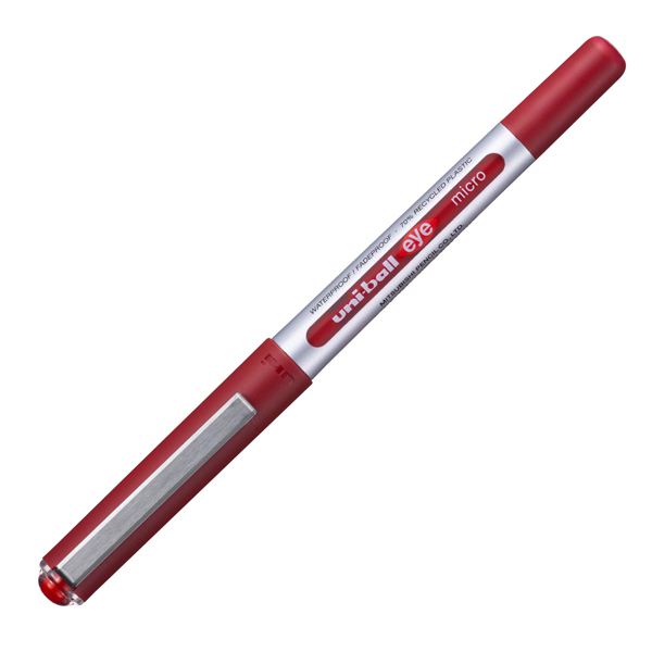 Roller uni-ball EYE ad inchiostro liquido. Resistente all'acqua e alla luce. Sistema 'Uni-Flow' per flusso uniforme e costante.Scrittura scorrevole e precisa. Finestrella per il controllo del consumo di inchiostro.Punta 0,5mm. Colore: rosso.