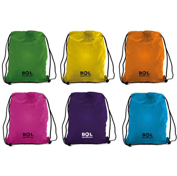Sacca T-bag in nylon 72D e cordino in tessuto. Dimensione: 38 x 50cm. 6 colori assortiti. Serigrafia piatta logo Bkl.