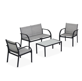 Set composto da un tavolino, un divano e due poltrone. Struttura in acciaio verniciato con vernici epossidiche di colore nero, rivestimento in textilene grigio me'lange. Tavolo rettangolare con top in vetro temperato spessore 5mm. Il set e' consegnato smontato e contenuto in un unico cartone.Articolo destinato ad esclusivo uso domestico. Non adatto ad uso pubblico.Set composto da:1 tavolino H38 x P45 x L80cm 2 poltrone H76,5 x P63 x L58,5cm 1 divano H76,5 x P63 x L108cm.