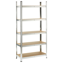 Scaffale in metallo galvanizzato ad incastro con 5 ripiani in mdf, spessore 4mm, portata massima 175kg per ripiano uniformemente distribuiti. Spessore struttura 0,63mm. Prodotto da assemblare. Dimensioni 180x40x90cm. Articolo destinato ad esclusivo uso domestico. Non adatto ad uso pubblico.