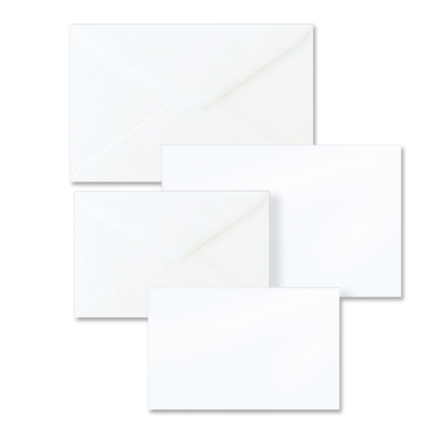 Scatola in acetato trasparente con 100 cartoncini bianco da 200gr liscio con 100 buste coordinate con patella e taglio a punta. Formato 4. Dimensioni 75x112mm.