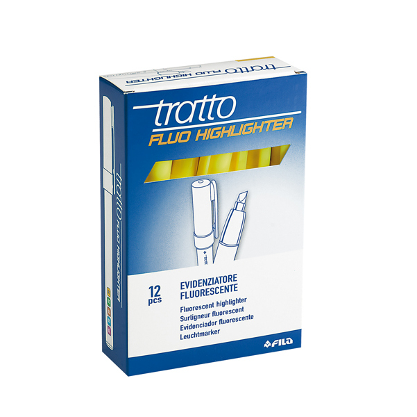 Evidenziatore Giallo Tratto Fluo Highlighter. Evidenziatore con inchiostro universale a base di acqua. Elevata fluorescenza. Punta a scalpello 1-5mm. Con tratto 1-5mm. Scatola da 12 evidenziatori fluo. Ideale per carta normale, autoricalcante, da fotocopie e fax. Particolarmente indicato per la scuola e il tempo libero. Idoneo sia per un uso scolastico che professionale. Colore: Giallo fluo. Tascabili. Materiale Plastica. Tipologia evidenziatori. Tipologia di punta: scalpello. Tratto 1-5mm. Inchiostro Base acqua. Garanzia di durata 3 anni. Confezione da 12 evidenziatori gialli Fluo. Green Pack. Codice produttore F733001. Marca Tratto di FILA. Made in Italy.