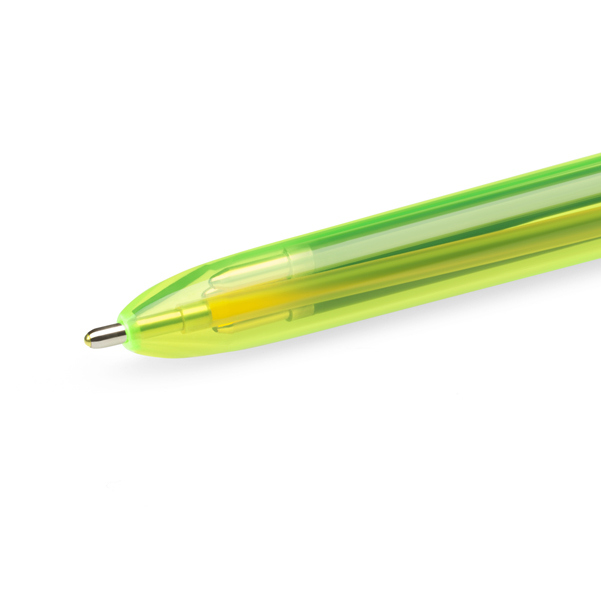 Penna a sfera con meccanismo a scatto. 4 colori di inchiostro: nero, blu, rosso e giallo fluorescente che permette di evidenziare. Punta 1,0mm/1,6mm. Sfera in carburo di tugsteno. Fusto con clip in resistente poliacetato traslucido di colore giallo fluorescente da 145mm con diametro da 12mm. Confezione 12 pezzi. 4 colori fluo - fusto giallo fluorescente.